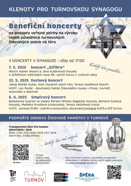 Restaurátoři chystají Článek o akci >> Turnovská synagoga získá natrvalo vzácné předměty. Vzniknou s pomocí studentů a pedagogů SUPŠ a VOŠ v Turnově Plakát k podpoře akce – koncerty