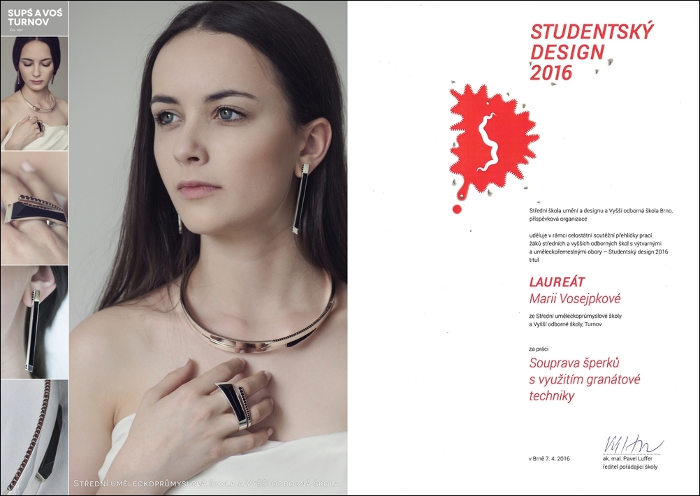 A proč se o této soutěži zmiňuji? Jednou z laureátek soutěže se stala žákyně oddělení zlatnictví a stříbrnictví Marie Vosejpková se svou soupravou šperků s využitím granátové techniky. Na fotografiích má tuto soupravu na sobě sama autorka, která pracovala pod vedením Ak. mal. Jiřího Studničky. V tak bohatě zastoupené kategorii produktového designu si tohoto ocenění velmi vážíme.